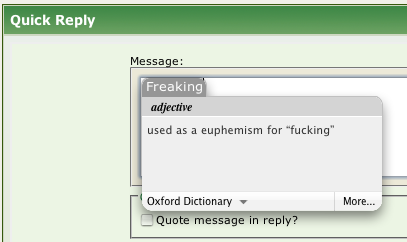 In Tiger you can mouse over any word on your screen and hit Control-Command-D and a window opens with the definition of that word. Freaking is Fucking it would seem.
