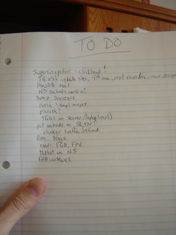I have one or umm 3 of them "To Do Lists" i love the dollar store i buy in bulk as i update my lists and i always keep a hardcopy of logins and pass stuff for servers/sponsors and so forth i keep a copy of that in my safe ( fire proof) . I would in this day of computers be lost with out pen and paper