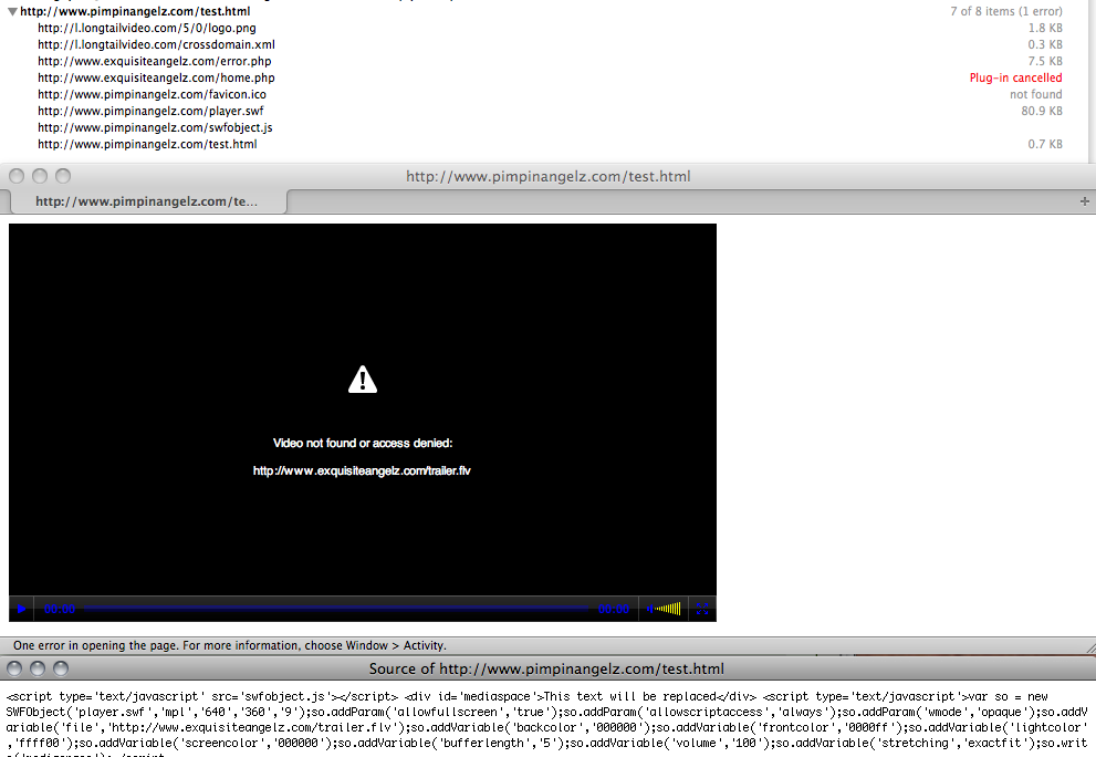 Sure. Here below, I have put up a video on a page located on pimpinangelz.com. If you look at the source code, you will notice that the video is on exquisiteangelz.com. If you try to play the video in any browser other than Firefox or Safari, it won't play. You get a 404 or access denied.
