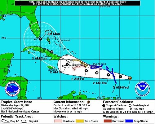 They keep revising the forecast for Isaac pushing it further towards the gulf, weakening a bit as it crosses Cuba and the Florida Straits.