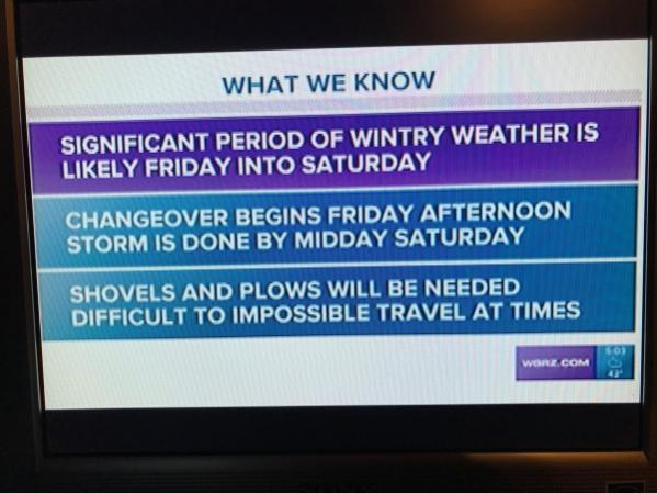 ![]() Fucking weather It's 50°F (10°C) now & supposed to get a little warmer today into tomorrow, which is when the shit starts to fly. Tomorrow's low is forecasted to be 10°F (-12°C) and there's a storm coming with it which will freeze everything & dump about a foot of snow on us. The local Weather Reader bimbo then actually put this graphic up on the screen during her forecast:I think even JustRobert would know that, if there's a foot of snow coming, you're gonna need a fucking shovel ![]() Grunted for Ramster a lot yesterday & actually got some of my own work done, which is the game plan for today, too |