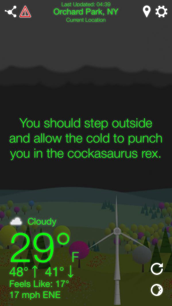 ![]() Still no news on UW's dog but we are getting the word out there.I drove The Bitch to work yesterday because she's a Nervous Nelly driving in bad weather. The Ice Storm was supposed to start around 2. Roads were fine when I picked her up at 9. The Weather Readers have inconvenienced me for the last time! From now on, I get all my weather from that sarcastic weather app What The Forecast?!! That's right! Get used to seeing those for the rest of your existence here on the board ![]() Up early to get some work done before The Bitch gets up & makes me start packing. And so it begins..... |