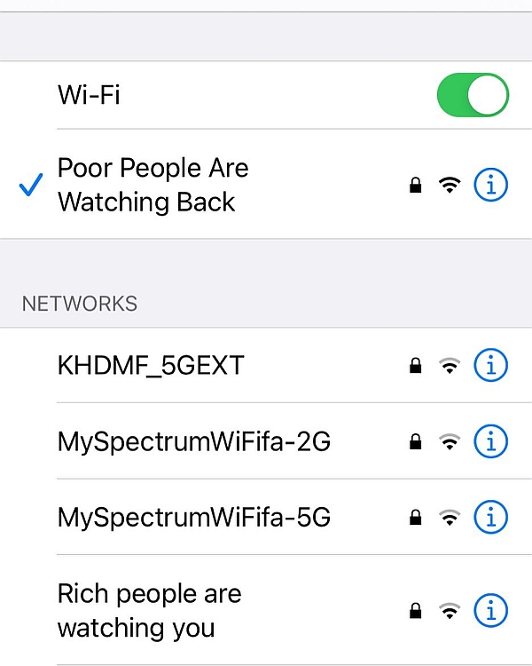 Before we watched the game, I stopped at Yell's to hook up his WiFi extender so we could have that internet thing in the garage. One of his neighbors named their WiFi "Rich people are watching you" so of course I had to name the new WiFi...