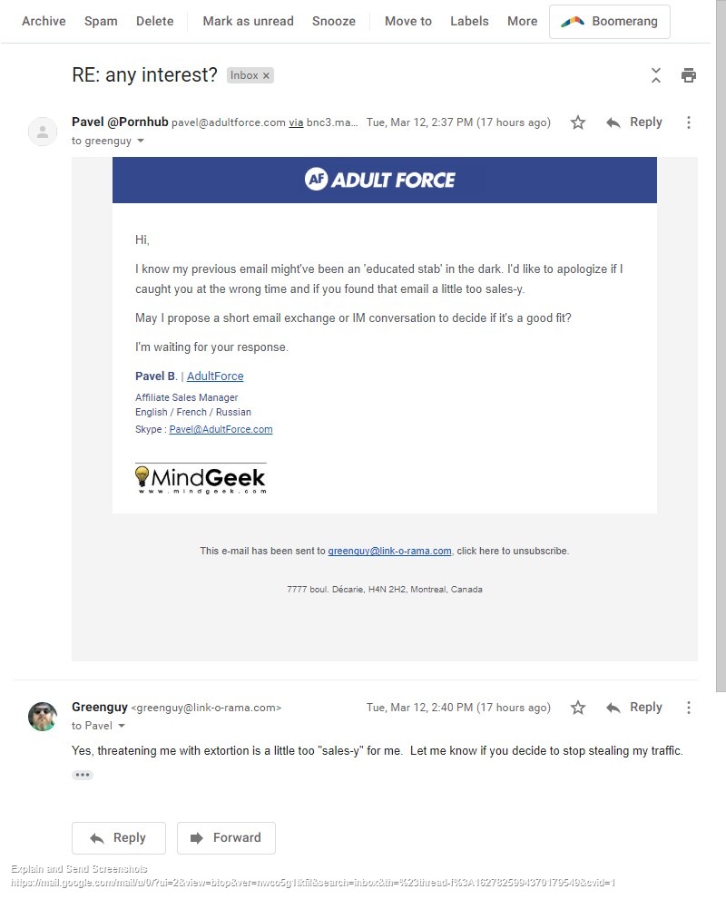 I'm still waiting for your reply to your last email. If I do, can I have some of the traffic that you're stealing from me on Google back?