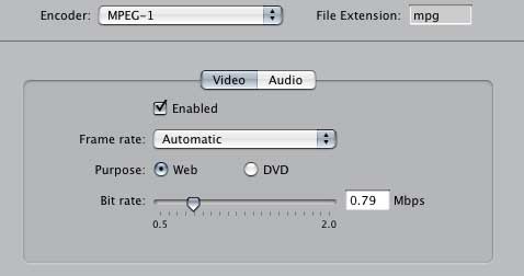 Here is a copy and paste from the preset that I'm using to compress them. I left Deinterlacing and Noise Removal on since that was the defaults. Name: MPEG-1 Web FA Description: Deinterlaced with noise reduction and FA copyright File Extension: mpg Audio Encoder Format: MPEG Sample Rate: 44.100kHz Channels: 1 Bits Per Sample: 16 Video Encoder Format: MPEG1 Width and Height: Automatic Pixel aspect ratio: default Crop: None Frame rate: (100% of source) Deinterlacing Algorithm: Odd Noise Removal Apply To: Chroma Channels Iterations: 1 Algorithm: Replace Watermark Position: Lower Left Scale By: 0.300000 Alpha: 1.000000 File Name: /Users/terri/Jobs/foxy-angel.com/•Stuff/FA logo for FCP.psd |