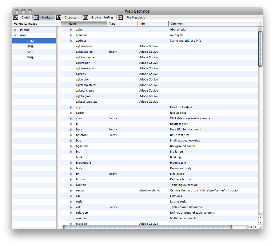 The problem I'm having is this: If I use an HTML Tag that's not recognized by Namo (like all of the new HTML5 Tags), when I use the "Clean Up HTML" tool to make all the code look pretty & whatnot, it removes all the unknown tags ![]() I spent a good 2 hours looking for a solution to this yesterday, both in the settings & help files for Namo as well as countless Google searches. Apparently, I'm the only one that has this fuckng problem ![]() There is a .dll file that might contain a list of valid HTML Tags, but I can't open the file in anything that's readable, let alone editable. I could insert the tags via a couple include files, but that seems like a lot of effort. And I could just go back & add them after I clean the HTML, but that seems like a HUGE pain in the ass. HELP ME!! ![]() |