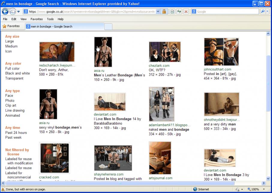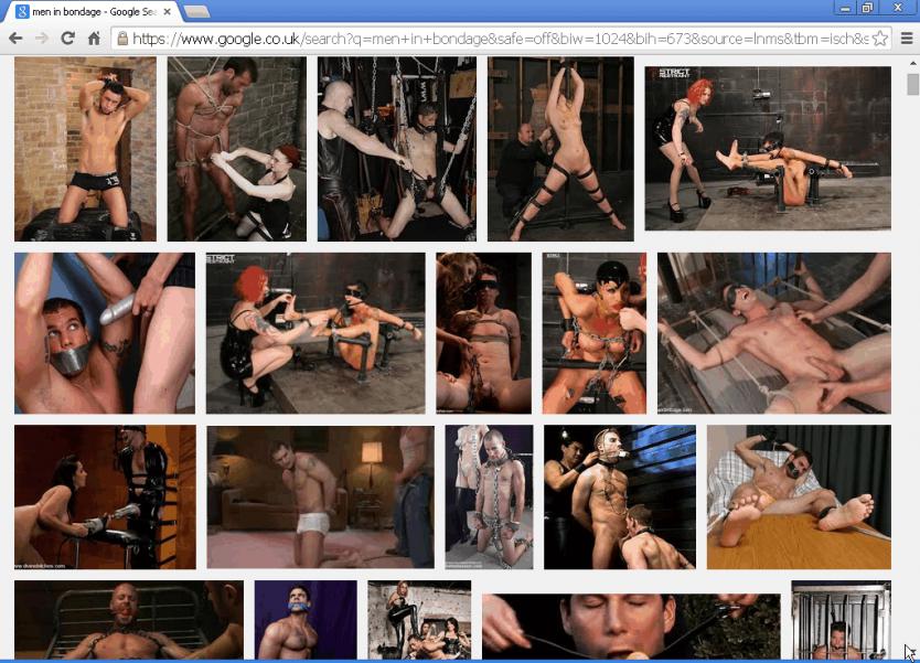 I needed photo references for drawings on a new project, so I did a Google picture search for "men in bondage" on Internet Explorer. While I was collecting photos IE crashed. This is a common error using IE8 on pages that require high resource use (I use XP) so I tried again using Chrome which is better on high resource pages. To my surprise I got a totally different set of results. Both had "adult content" set "on".