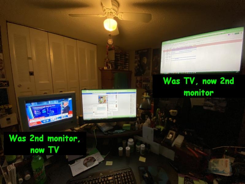 Here's a fantastic way to fuck up your work space! My stepdaughter got the OK to work from home & needed a 2nd monitor. The only one we could find quick & cheap has the old VGA & DVI inputs. I assumed I could get an adapter quick & cheap Amazon's no longer offering 2 day on ANYTHING and the cheapest I can find one locally is - get this - $30! For a fucking VGA to HDMI that's $6 on Amazon So being the nice guy that I am, I loaned her my 2nd monitor, which leaves me like this for the next few days: