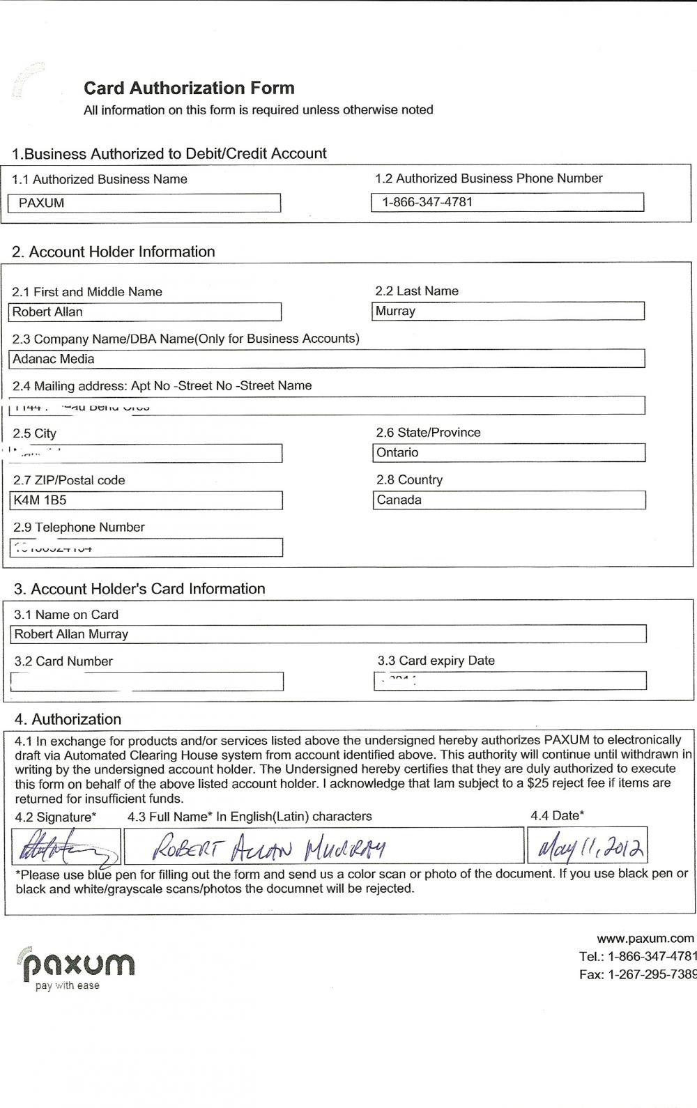 The issue is having it allow me to use my credit card load my paxum account, that's it. I sent in a copy of my drivers license and passport again (old ones expired) and there was no issue with them. I sent in a scan of my credit card fonrt and back, no issue. But their damn paperwork showing my signature keeps getting rejected. Does THIS look hard to read? Can you NOT see my name and signature clearly? (I blurred out the card and my address obviously to show you the form)  |