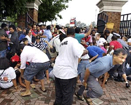 Officials opened the gates at 7 a.m., but some already had been waiting for hours in line. When the gates opened, it became a terrifying mob scene.