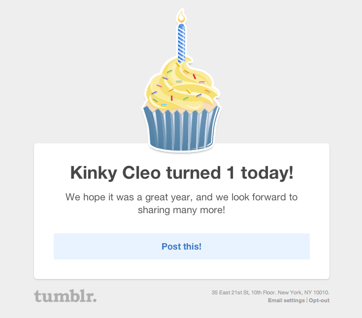 Thought this was pretty funny. Seems Kinky Cleo turned 1 today.