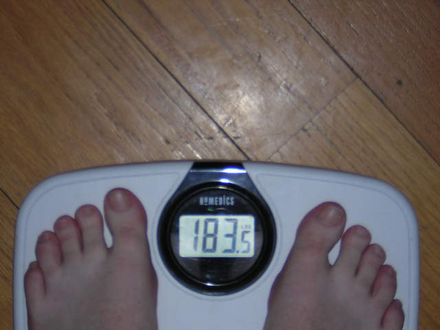 183... 2 more pounds to go. I haven't been a very good boy, overall, eating some really good things like pizza, chicken wings, and such... interestingly though I am not dropping pounds very quickly, my size and shape has changed quite a bit. The last 2 pounds should melt off in a couple of days. Alex |