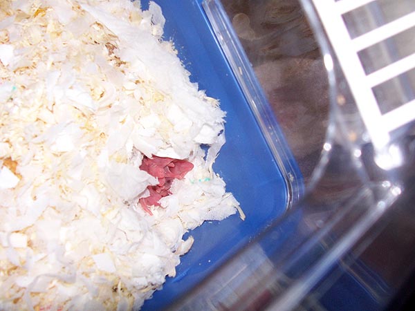 Crystal gave birth to about 6 or more of the little critters in the night. The kids are thrilled this morning. Personally I think they're ugly little fuckers : about an inch long, pink, black eyes and blind. Nice. Respect to Willy though ... it appears I named him aptly