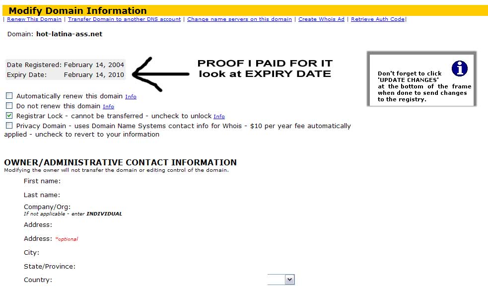 Look at this - I'm looking at my domains - groaning at how much work I'll have to do - and check the entry for hot-latina-ass.net - and what do I see - my entry shows that it was indeed paid for....