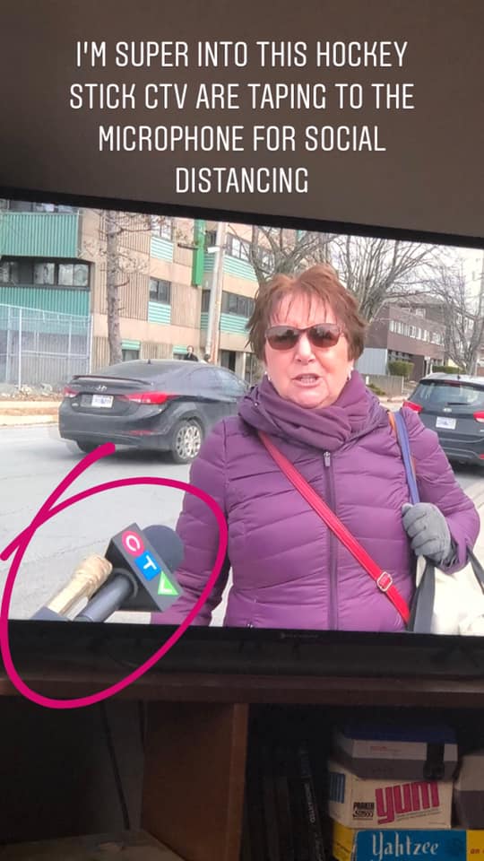 Canadian TV reporter uses hockey stick to aid in social distancing.