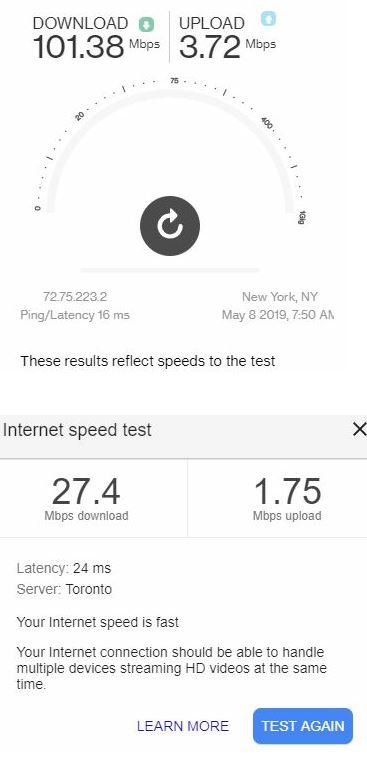 Need to call & complain to Verizon today about my upload speed. I'm paying for 100/100 & when I run the test on their server, I get 100/10 if I'm lucky. They sent me a new modem, so I've been testing that randomly the last few days. The top is what Verizon says my speeds are this morning, the bottom Google: