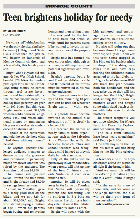 Yes, I definitely thought of Jim when I read this story, and wondered if someone from his (wife's?) family had run away to Key West years ago. From the story: He wore a red T-shirt, but that was the only physical similarity between J.J. Bright and Santa Claus, other than the gifts he will bestow on hundreds of Monroe County children, and a few adults, this holiday season. Bright, who's 14 years old and attends Key West High School, bought 320 bikes for underprivileged kids in the Florida Keys using money he earned through real estate investments and fundraising efforts.The whole story is attached below. Merry Christmas world. ![]()