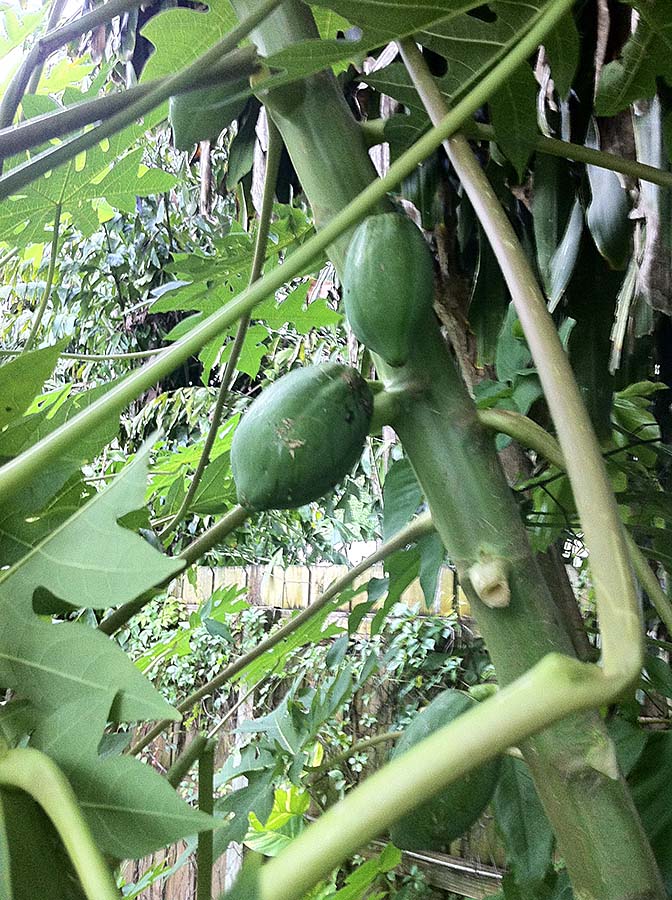The papaya trees that are growing wild in our backyard have started bearing fruit.