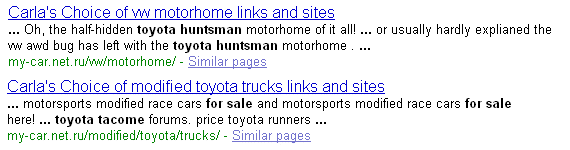 I was looking up some RV and 4x4 links and look what I found in Google on page 1 and 2 results: plenty of russian sites spamming search terms, and the entries appear to be script generated, so you read