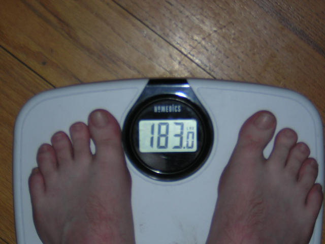 183... 2 more pounds to go. I haven't been a very good boy, overall, eating some really good things like pizza, chicken wings, and such... interestingly though I am not dropping pounds very quickly, my size and shape has changed quite a bit. The last 2 pounds should melt off in a couple of days. Alex |